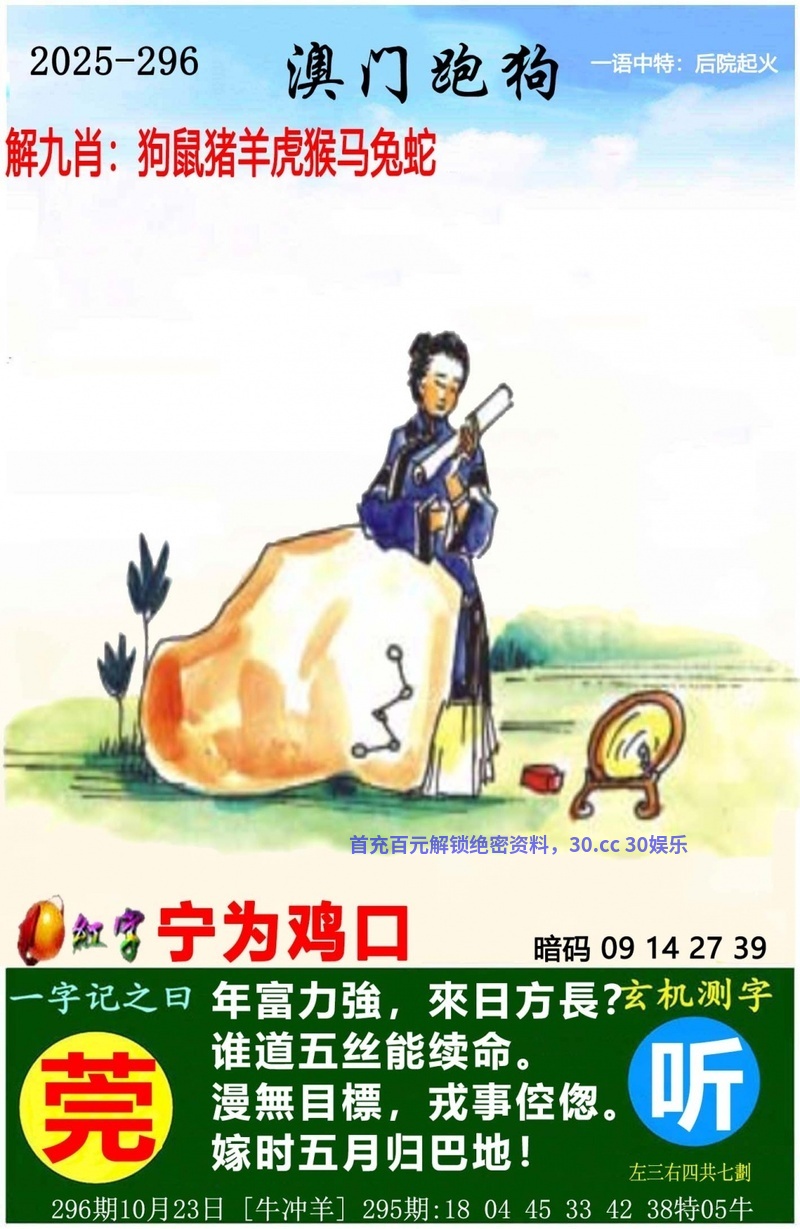 | 296期:【跑狗特码诗】开猴22 玄机诗云年富力強,來日方長?谁道五丝能续命。漫無目標,戎事倥偬。嫁时五月归巴地! 诗句解图中是一个女子拿着一幅字画站在假石旁边看着地上的物品,解女肖羊蛇兔鸡猪,宁为鸡口,解家禽生肖鸡羊狗马牛猪, |