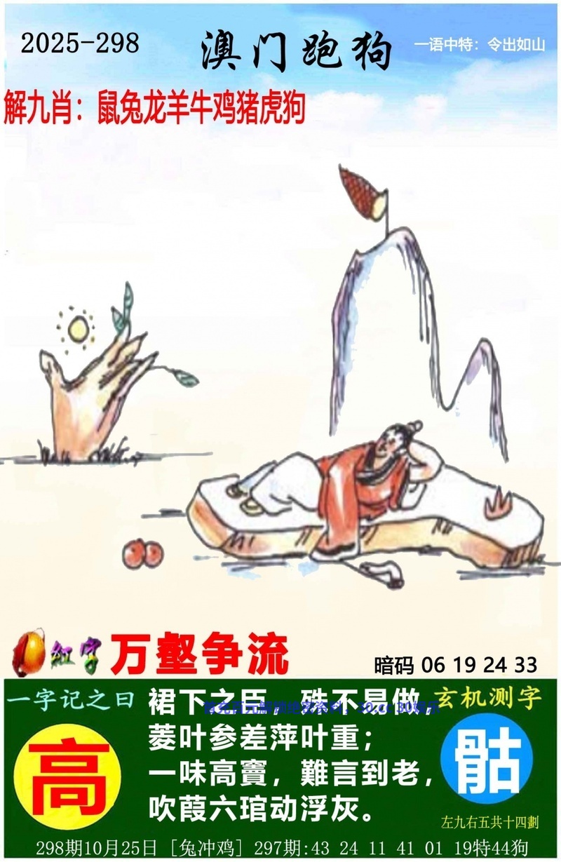 | 298期:【跑狗特码诗】开羊23 玄机诗云裙下之臣,殊不易做,菱叶参差萍叶重;一味高寶,難言到老,吹葭六琯动浮灰。 诗句解图中是一个男人躺在石板上休息,解吉美生肖兔龙蛇马羊鸡,万壑争流,解天肖兔马猴猪牛龙 单双:单数 |
